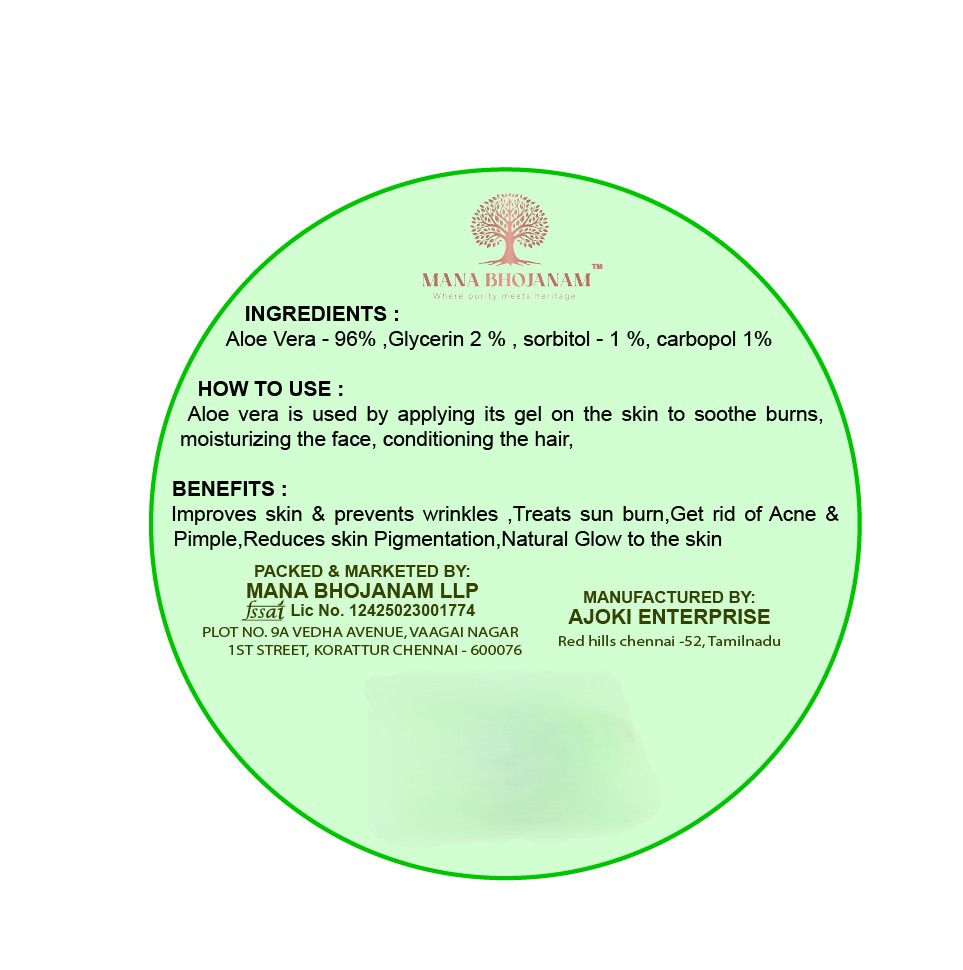 | Mana Bhojanam Aloe Vera Gel is prepared using high-quality aloe vera leaves to retain their natural soothing and hydrating properties. This gentle, non-sticky gel helps moisturise skin, calm irritation, and nourish hair and scalp. Suitable for daily use, aloe vera gel can be applied directly to the skin or hair. Free from harsh chemicals, parabens, and artificial colours, it reflects Mana Bhojanam’s commitment to natural, homely, and safe personal care. |