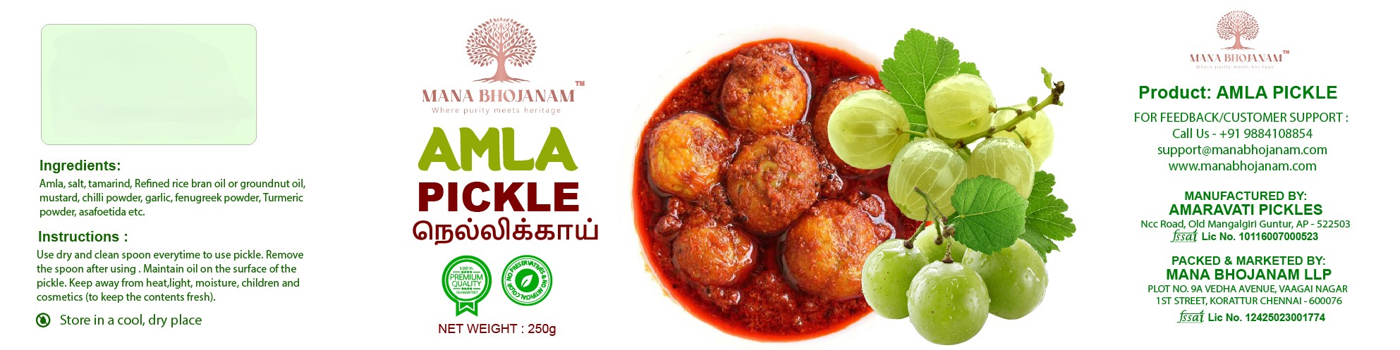 Mana Bhojanam Amla Pickle is prepared using fresh, handpicked amla (gooseberry) blended with traditional spices and cold pressed oil, following authentic homely recipes. Known for its tangy taste and rich flavour, this pickle adds a delicious punch to simple meals. Amla is traditionally valued for its natural goodness, and this pickle is made without artificial colours or preservatives. Carefully prepared and hygienically packed, it delivers homemade taste and quality in every spoon.
