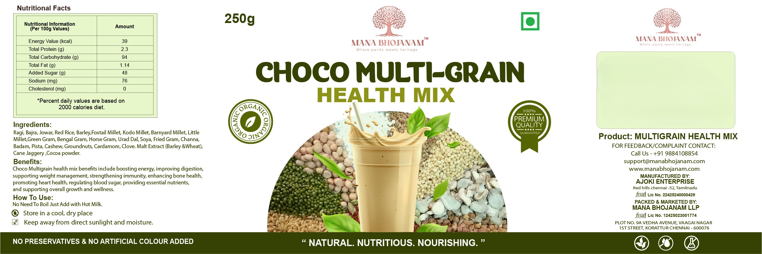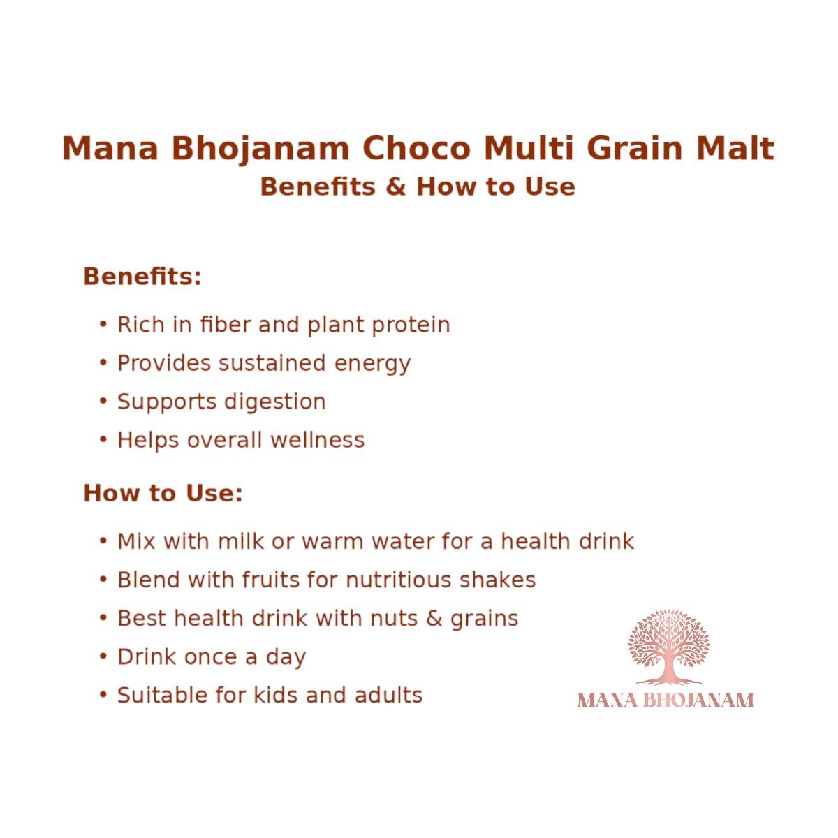 Mana Bhojanam Choco Multi-Grain Health Mix combines the goodness of multiple nutritious grains with a delightful choco taste, making healthy nutrition enjoyable. Rich in fibre, essential nutrients, and natural energy, this health mix supports growth, digestion, and overall wellness. Easy to prepare and gentle on the stomach, it is ideal for children who prefer chocolate flavour as well as adults looking for a nutritious daily drink. Prepared without artificial colours or harmful additives, this mix offers a perfect balance of taste and health.