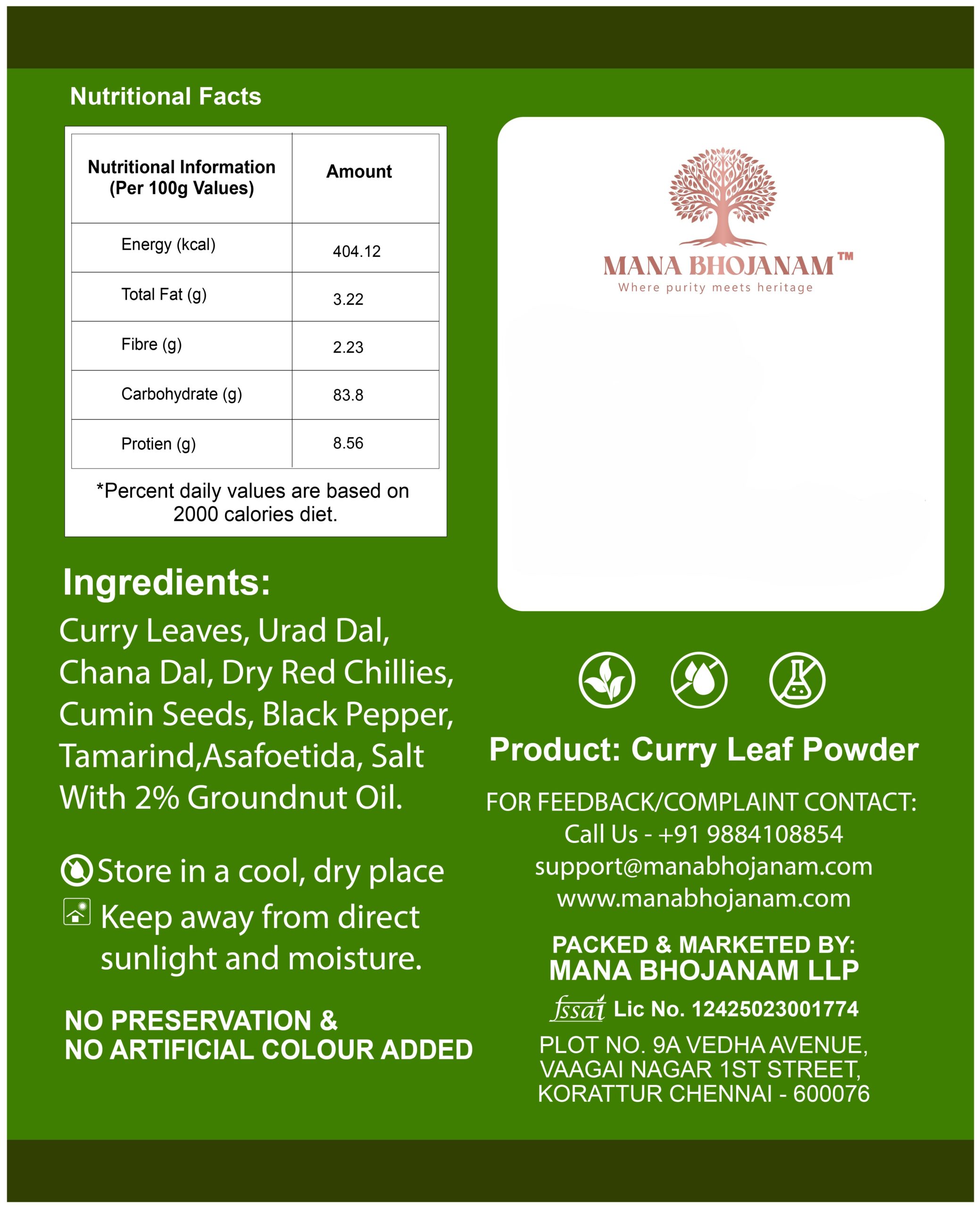 Mana Bhojanam Curry Leaves Powder is prepared from fresh, handpicked curry leaves that are shade-dried and finely ground using traditional methods. Known for their rich aroma and nutritional properties, curry leaves are commonly used in South Indian cooking and traditional wellness practices. This powder can be used as a seasoning, mixed with rice and ghee, and also used in Idli’s & Dosa. Free from preservatives, artificial colours, and additives, it delivers pure flavour and natural goodness in every spoon.