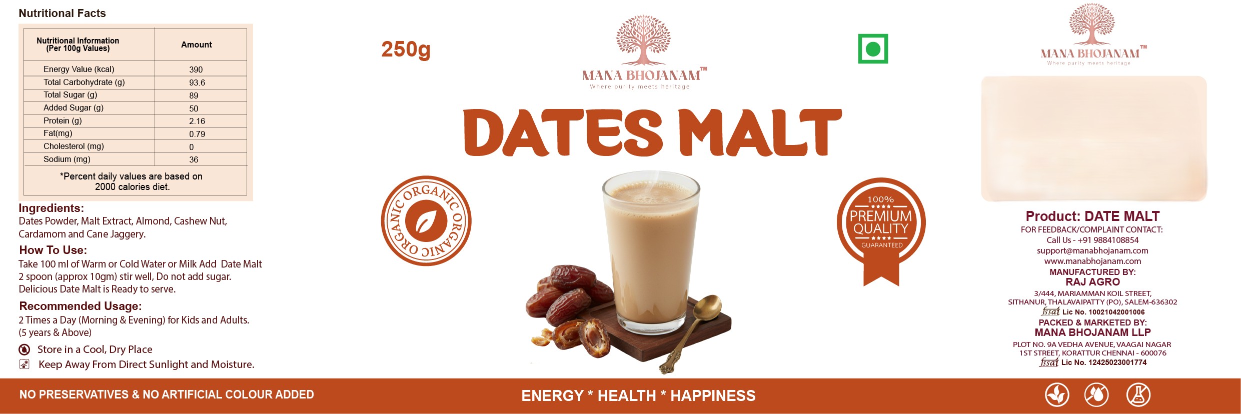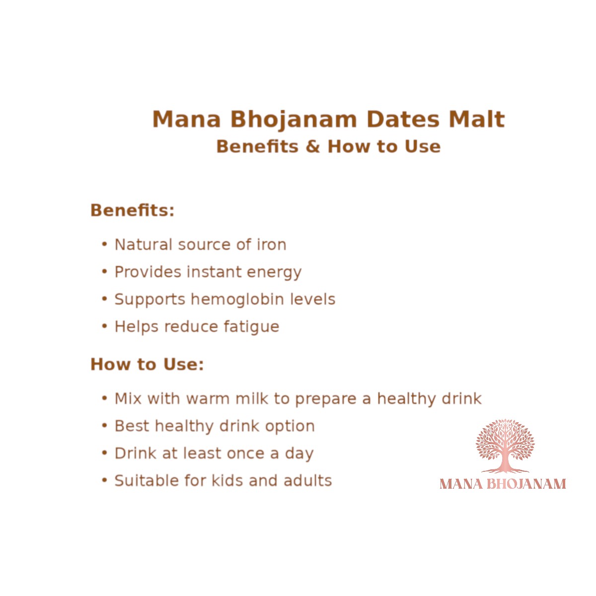 Mana Bhojanam Dates Malt is a wholesome health drink prepared using carefully selected dates, blended with natural ingredients through traditional homely methods. Naturally rich in iron, fibre, and essential minerals, dates malt supports energy levels, digestion, and overall vitality. With its natural sweetness, this malt is an excellent choice for children, adults, pregnant women, and elders. It can be consumed daily as a nourishing drink without the need for added sugar. Prepared without artificial colours, flavours, or preservatives, Mana Bhojanam Dates Malt reflects our commitment to pure, natural, and healthy food products.