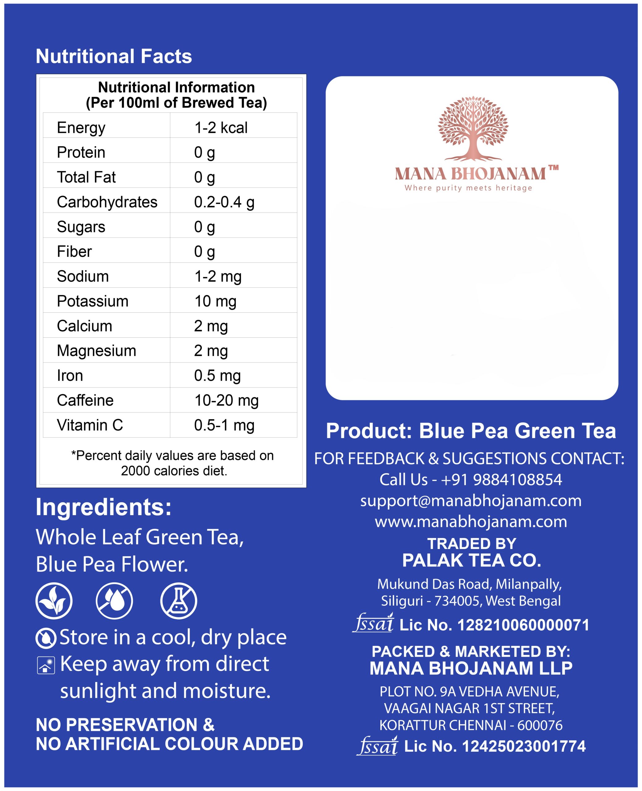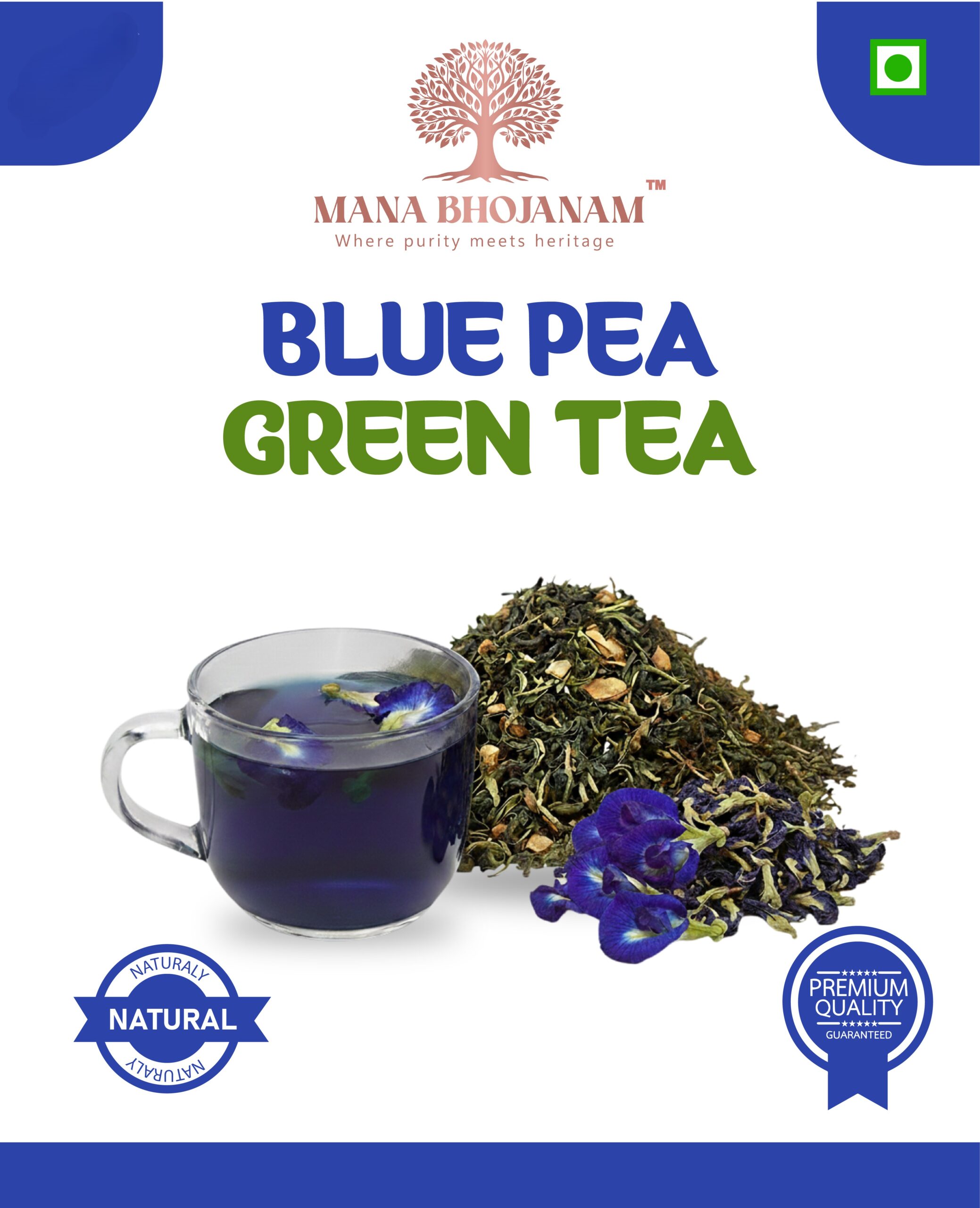 Mana Bhojanam Blue Pea Green Tea is a unique herbal blend combining premium green tea leaves with blue pea flower (Butterfly Pea). Known for its striking blue colour and antioxidant properties, blue pea has been traditionally used to support mental clarity, relaxation, and overall wellness. This tea brews into a beautiful blue shade and turns purple with the addition of lemon, making it both healthy and visually delightful. Free from artificial colours, flavours, and preservatives, it is ideal for a calming and refreshing daily tea ritual.