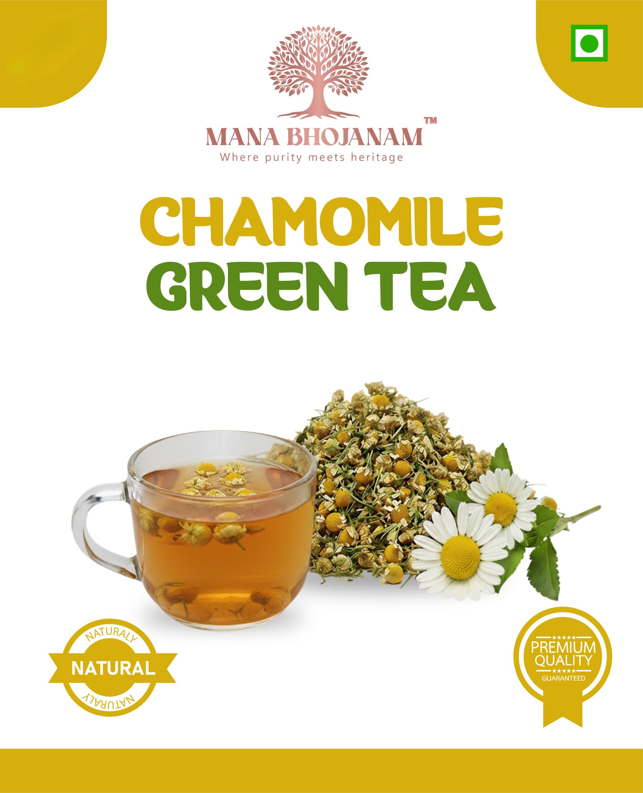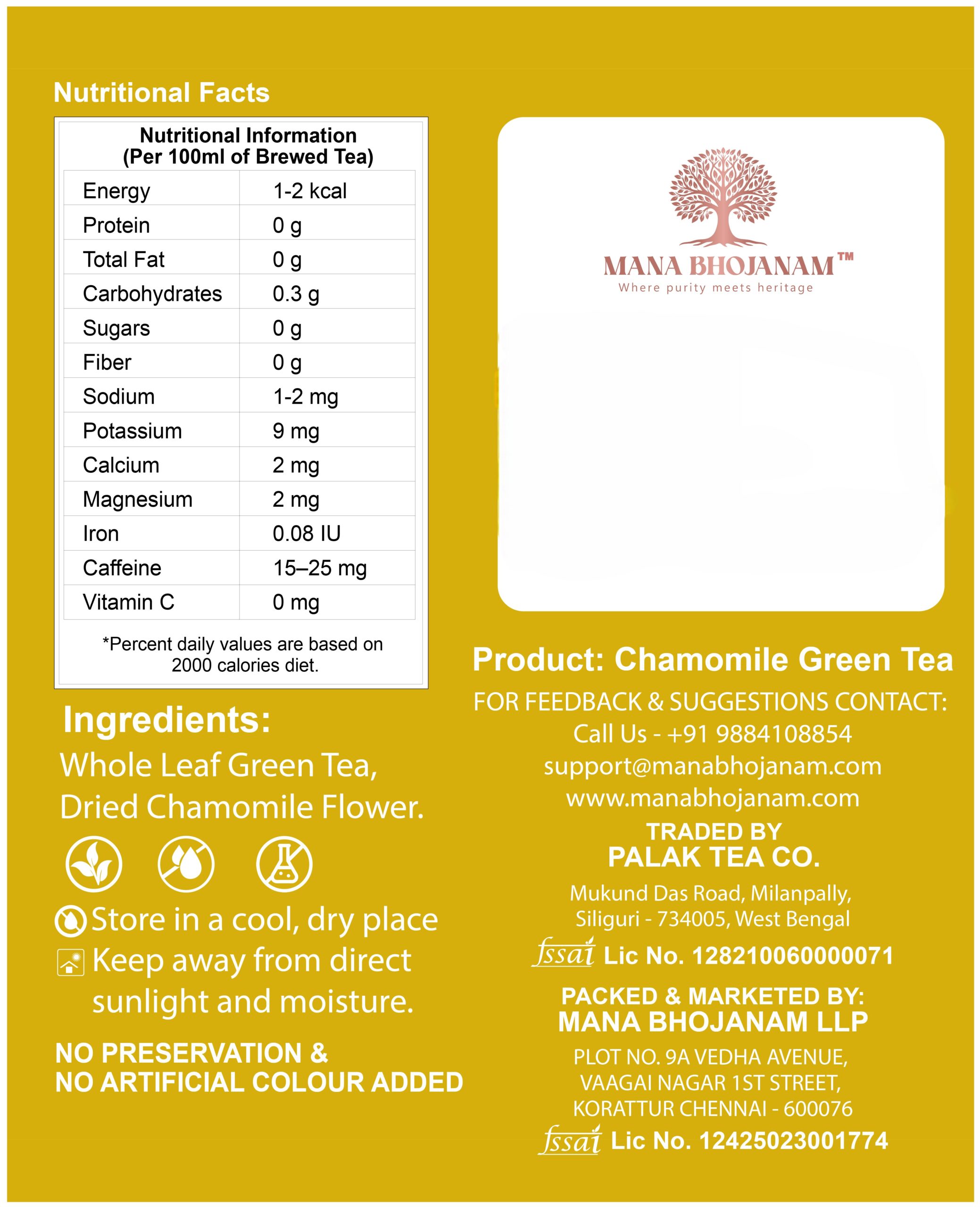 Mana Bhojanam Green Tea – Chamomile is a gentle blend of green tea leaves and chamomile flowers, traditionally known for their calming and soothing properties. This tea offers a mild, floral taste with a refreshing finish, making it ideal for unwinding after a long day. Naturally aromatic and free from artificial colours, flavours, and preservatives, this tea is suitable for daily consumption. Enjoy it warm for relaxation or chilled for a refreshing herbal drink.