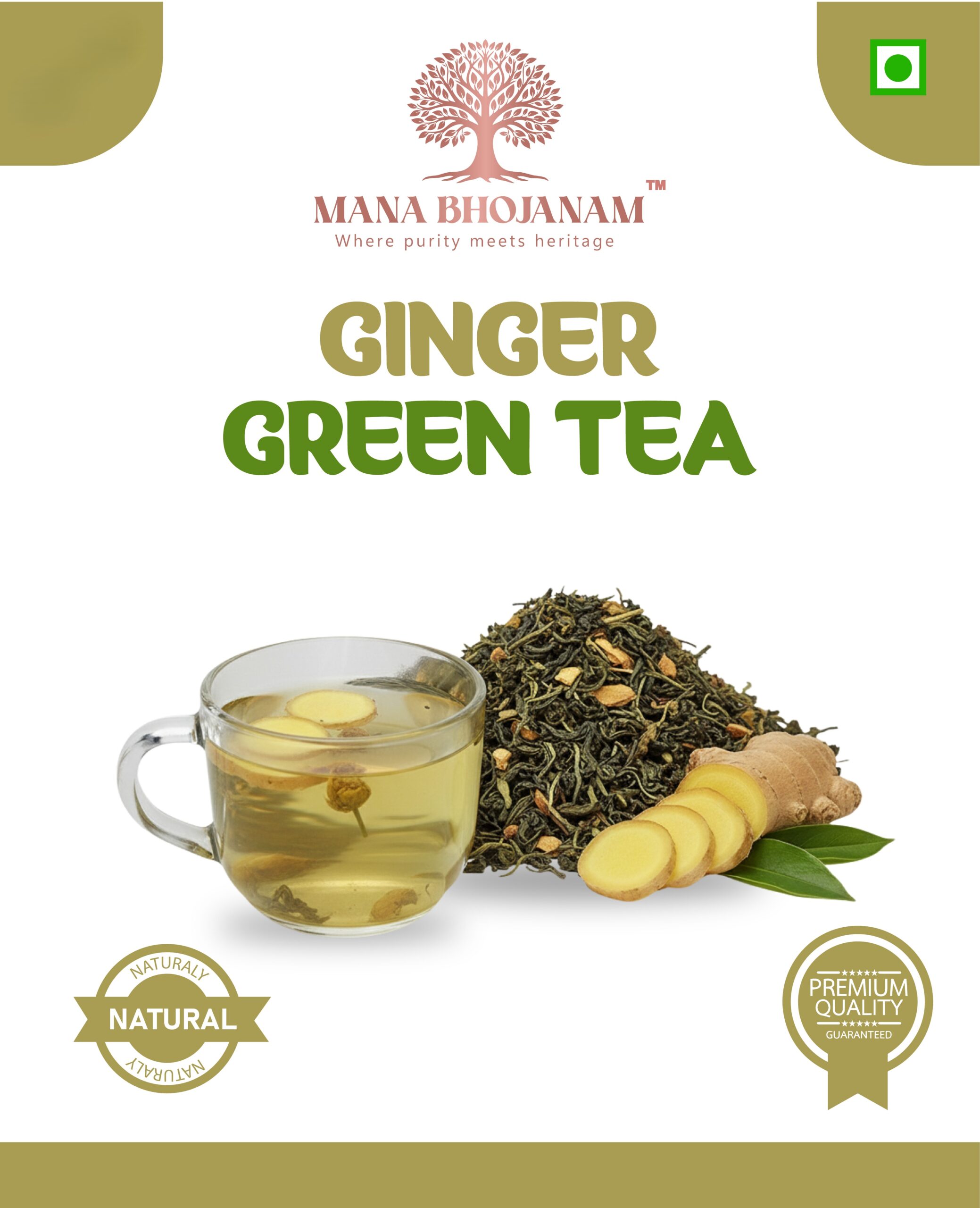 Mana Bhojanam Green Tea – Ginger combines the goodness of green tea leaves with the warm, aromatic spice of ginger. This refreshing blend offers a balanced taste with a gentle spicy note, making it perfect for everyday wellness. Traditionally, ginger is valued for supporting digestion and comfort, while green tea provides natural antioxidants. Free from artificial colours, flavours, and preservatives, this tea is ideal to enjoy in the morning or after meals.