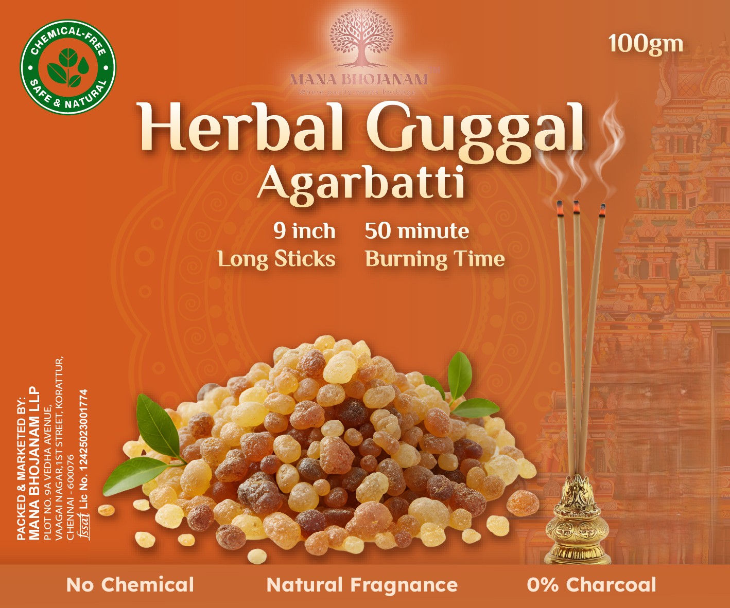 Mana Bhojanam Herbal Guggul Agarbatti is traditionally prepared using pure guggul (Commiphora resin) blended with natural herbs and aromatic ingredients. Guggul has been used since ancient times for its sacred fragrance, purification properties, and spiritual significance. When lit, this agarbatti releases a soothing, earthy aroma that helps create a calm, peaceful, and divine atmosphere. Ideal for daily pooja, meditation, yoga, and homam rituals, it is free from synthetic fragrances and harsh chemicals, preserving purity and tradition.
