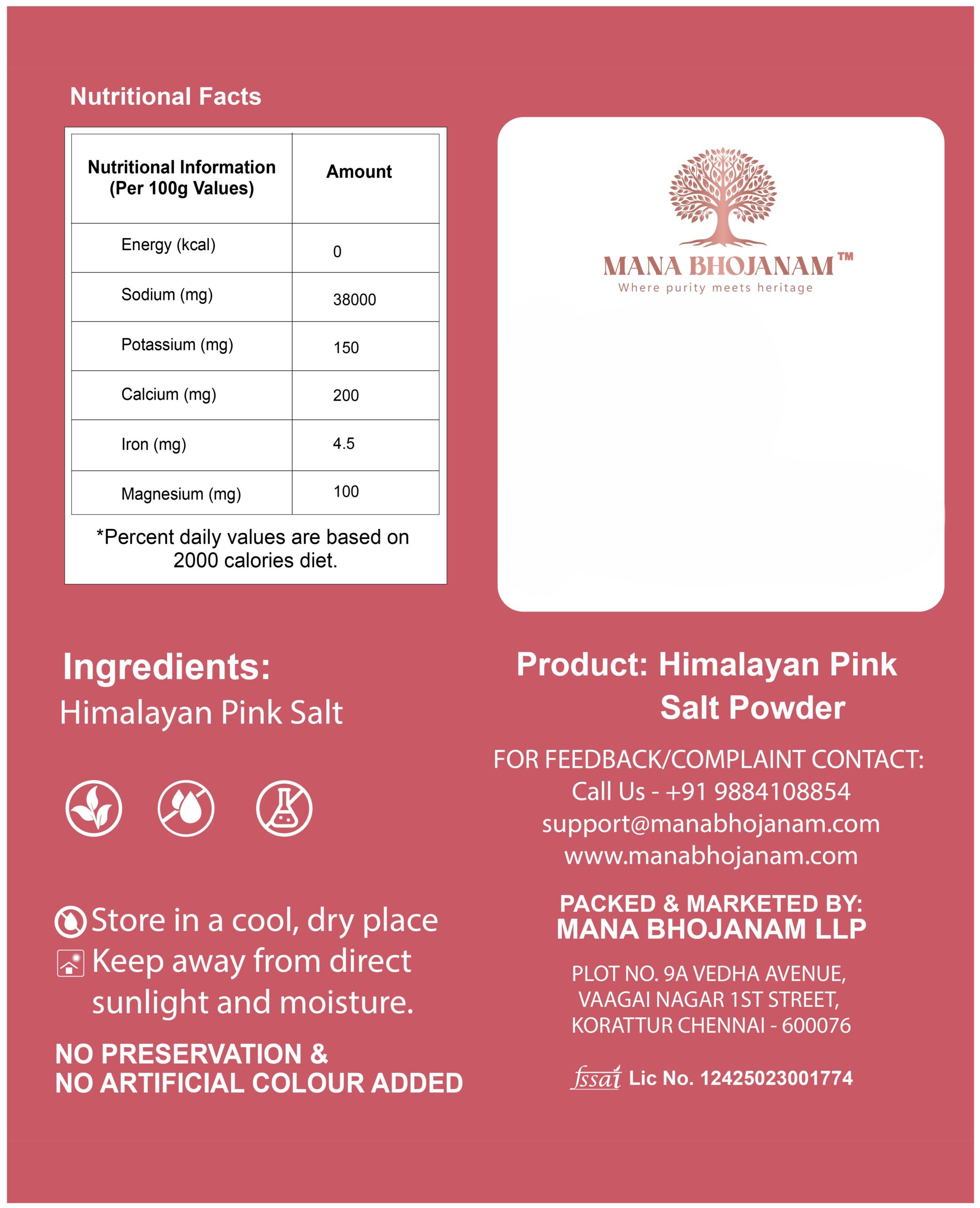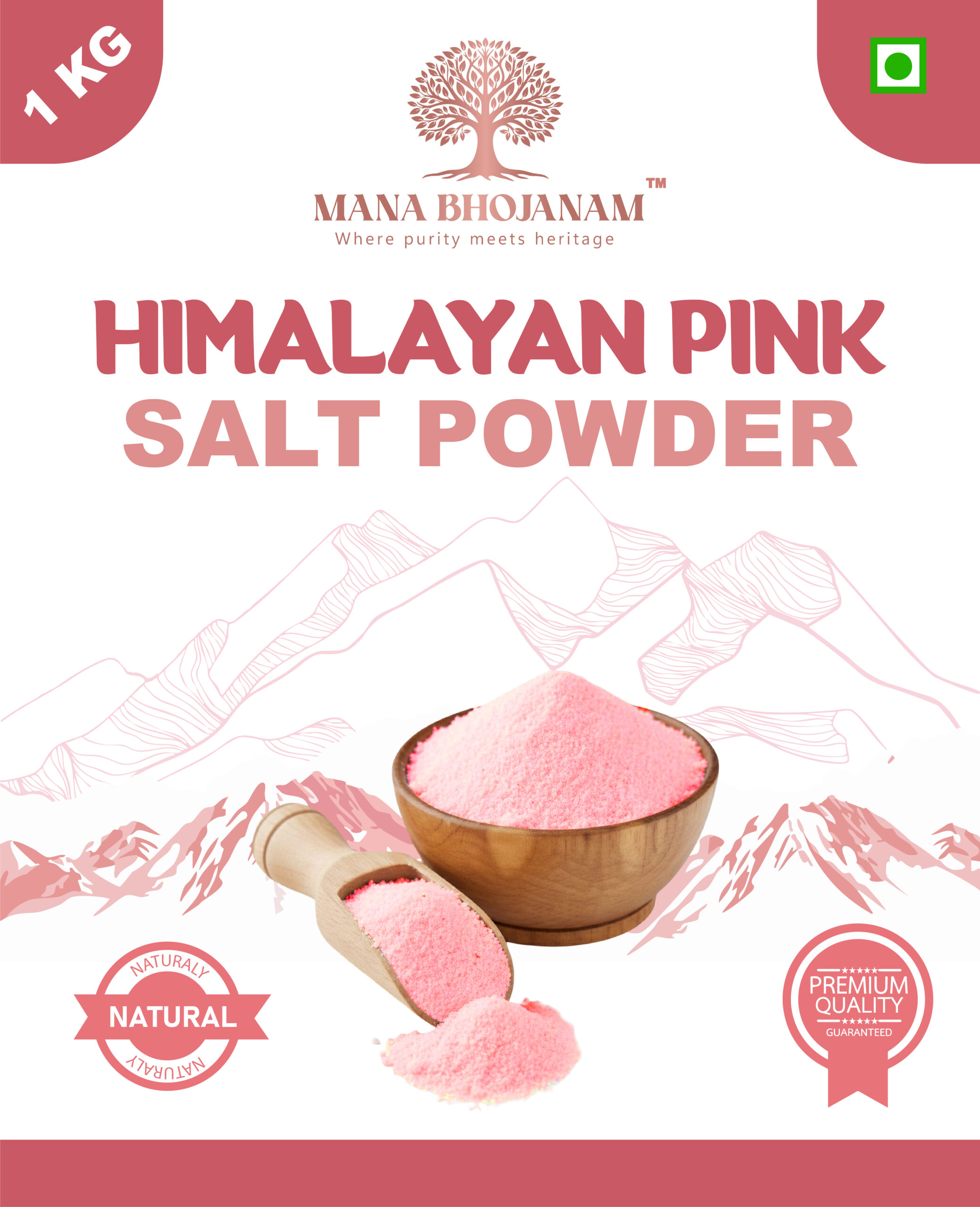 Mana Bhojanam Himalayan Pink Salt is a natural, unrefined salt sourced from ancient Himalayan salt mines. Carefully cleaned and finely ground, this salt retains its natural pink colour and trace minerals without chemical processing or bleaching. Perfect for daily cooking, seasoning, and table use, Himalayan pink salt enhances the natural flavour of food. Free from additives and anti-caking agents, it is a wholesome alternative to refined white salt for health-conscious families.