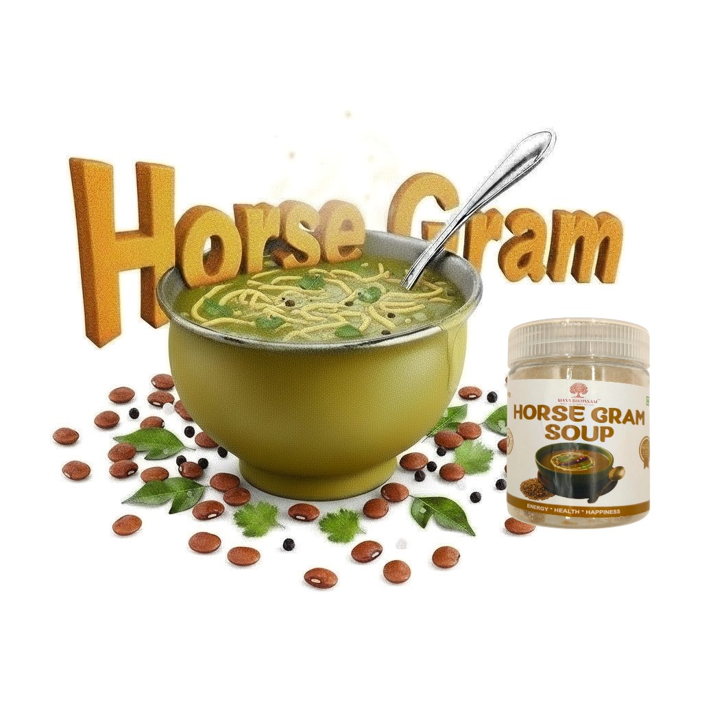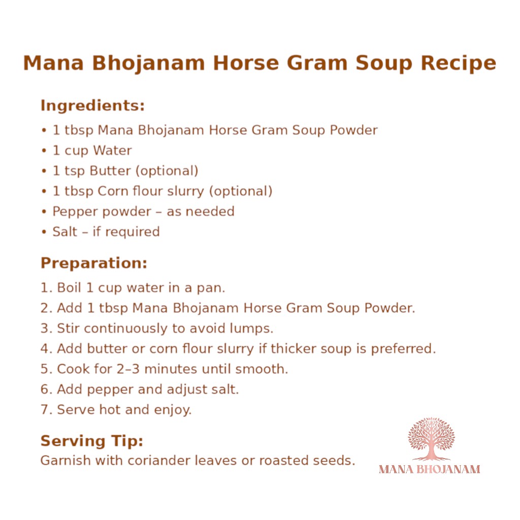 Mana Bhojanam Horse Gram Soup is a traditional South Indian health soup prepared using horse gram (kollu) and carefully selected natural spices. Known for its high protein and fibre content, horse gram is traditionally consumed to support digestion, strength, and overall wellness. This soup is warming, filling, and easy to digest, making it suitable for regular consumption by adults and elders. Prepared using homely methods without preservatives, artificial colours, or flavours, it delivers authentic taste and nutrition in every serving.