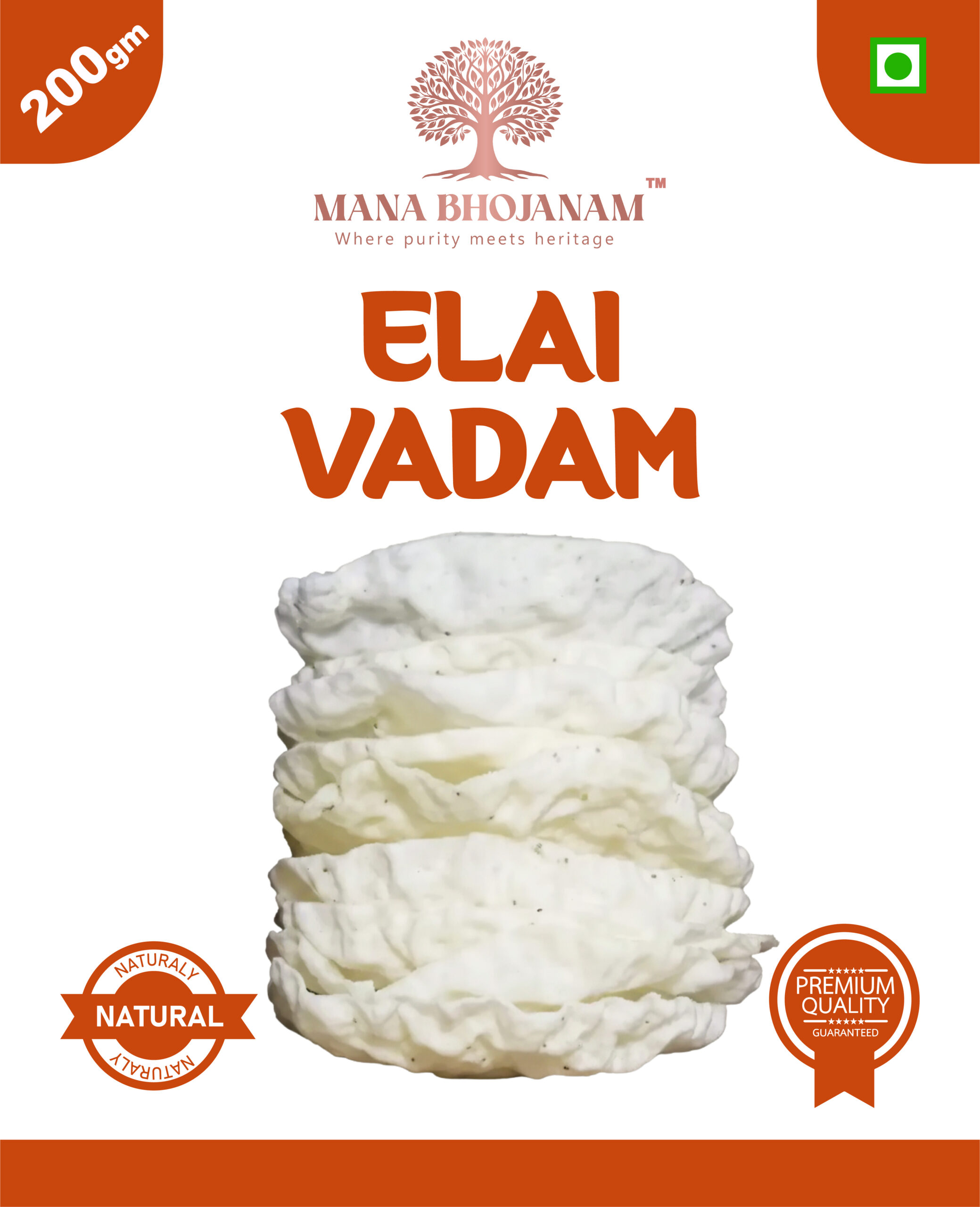 Mana Bhojanam Ilai Vadam (Vathal/Appalam) is a traditional South Indian accompaniment prepared using natural leaf (ilai) extract and carefully selected ingredients. Made following age-old homely methods, these vadams are sun-dried to preserve flavour, aroma, and crispiness. When fried or roasted, ilai vadam turns light, crispy, and tasty, making it a perfect side dish for rice meals, sambar, rasam, curd rice, and festive lunches. Free from artificial colours and preservatives, it reflects the authentic taste of homemade vathals. At Mana Bhojanam, every batch is prepared with care, hygiene, and quality to bring you pure, traditional food just like home.