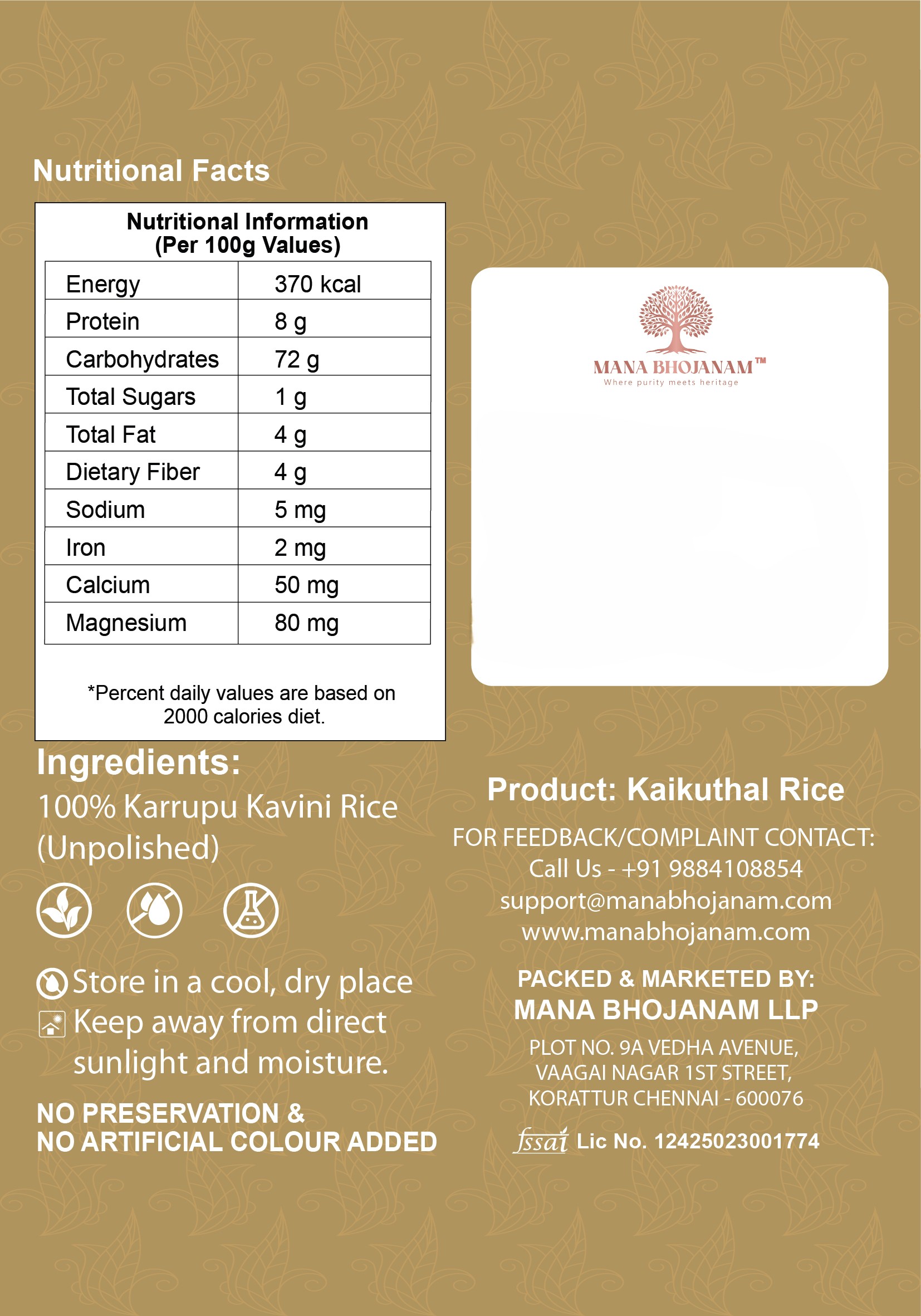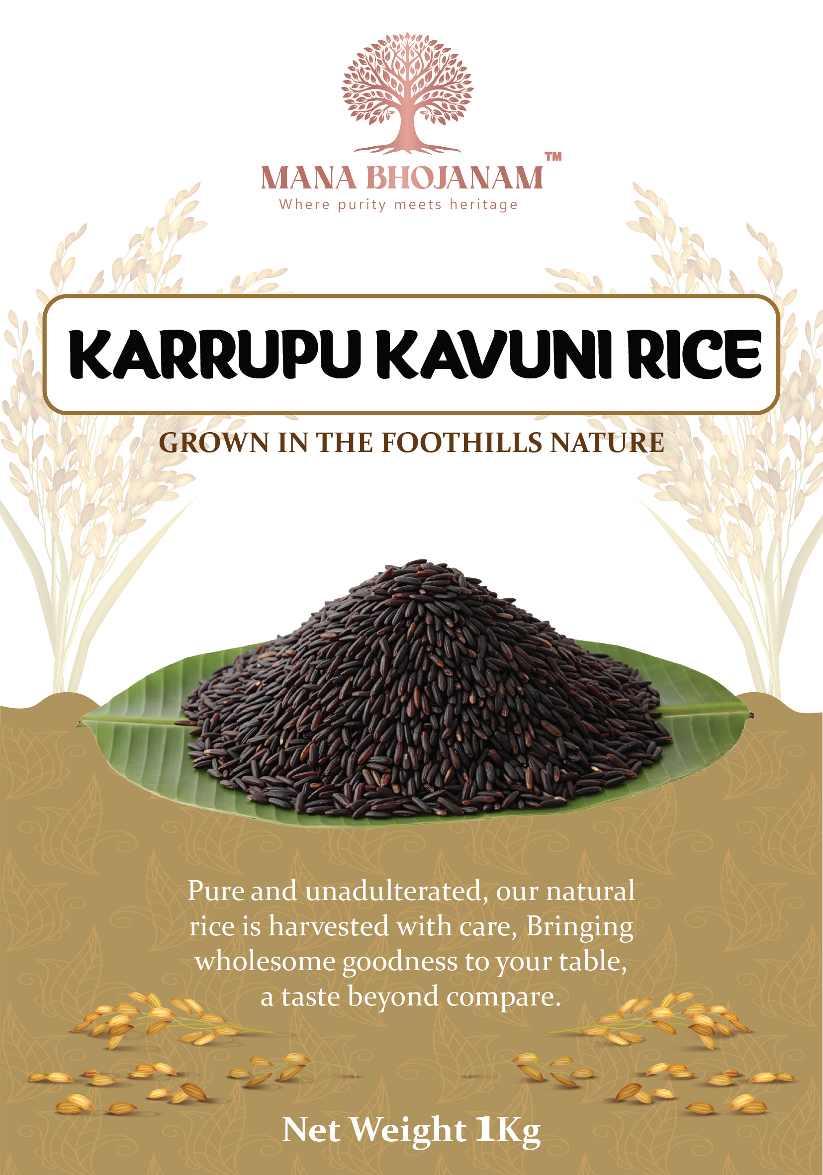 Mana Bhojanam Karuppu Kavuni Rice is a traditional heritage variety of black rice native to Tamil Nadu. Known for its deep black colour and rich nutritional profile, kavuni rice was traditionally consumed by royalty and is now valued for its natural goodness. This rice is rich in fibre and natural antioxidants and has a distinct nutty flavour and chewy texture. It is suitable for preparing healthy meals, kanji, sweet dishes, and traditional recipes. Grown and processed carefully, this rice is free from polishing and artificial treatments.