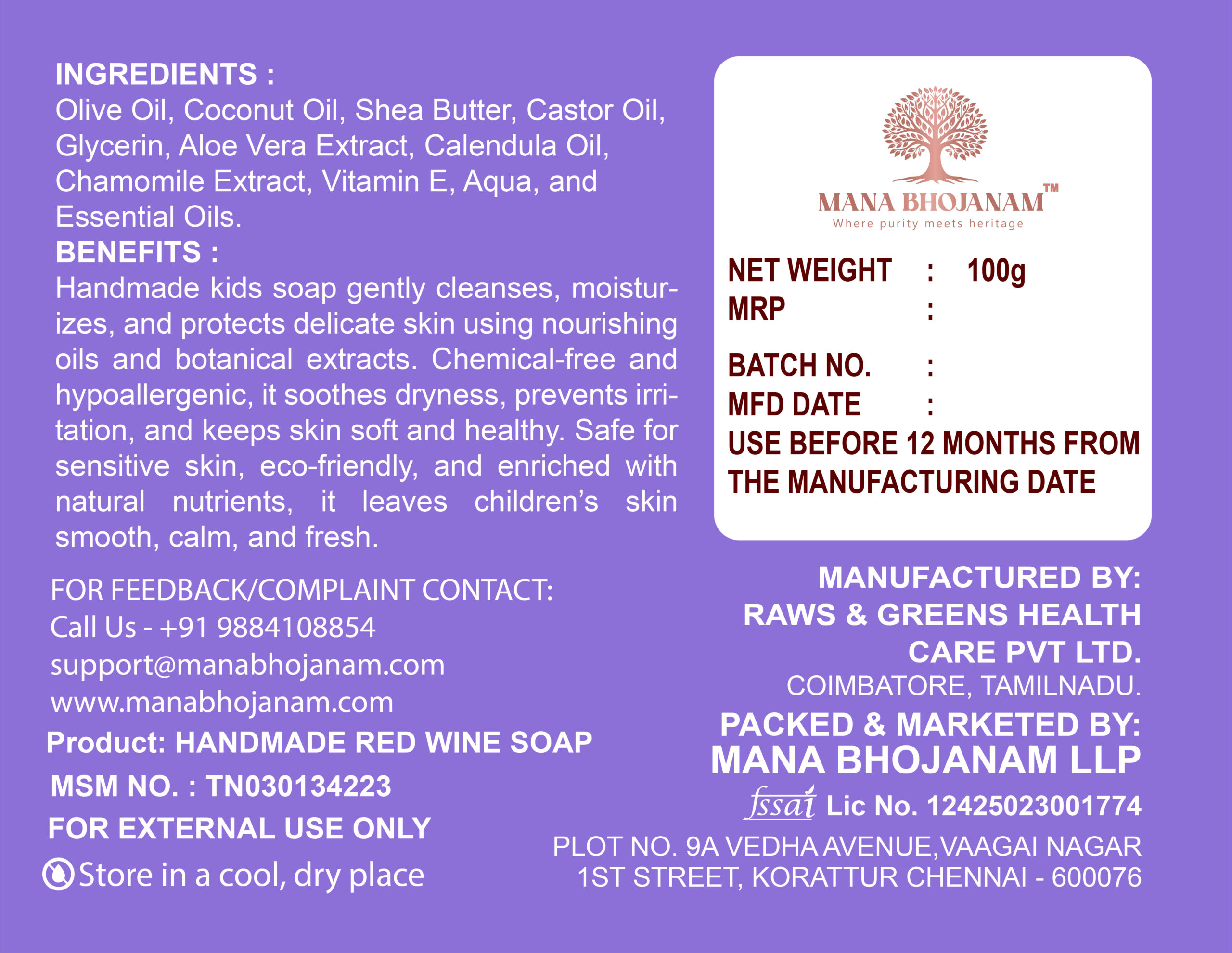 Mana Bhojanam Kids Handmade Soap is thoughtfully handcrafted using gentle, skin-friendly ingredients suitable for children’s sensitive skin. The mild formula cleanses effectively without causing dryness or irritation, making bath time safe and enjoyable for kids. Free from harsh chemicals, artificial colours, and strong fragrances, this handmade soap helps maintain the natural moisture balance of young skin. Ideal for daily use, it leaves the skin soft, smooth, and fresh after every bath.