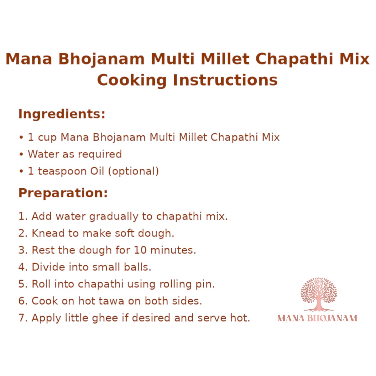 | Mana Bhojanam Multi Millet Chapathi Mix is a carefully crafted blend of multiple nutritious millets, prepared using traditional homely methods. Rich in fibre, plant-based protein, and essential minerals, this mix supports digestion and sustained energy while helping you make soft and flavourful chapathis. Suitable for daily meals, this chapathi mix is ideal for health-conscious families. It contains no maida or preservatives and offers a nutritious alternative to refined wheat flour without compromising taste or texture. |