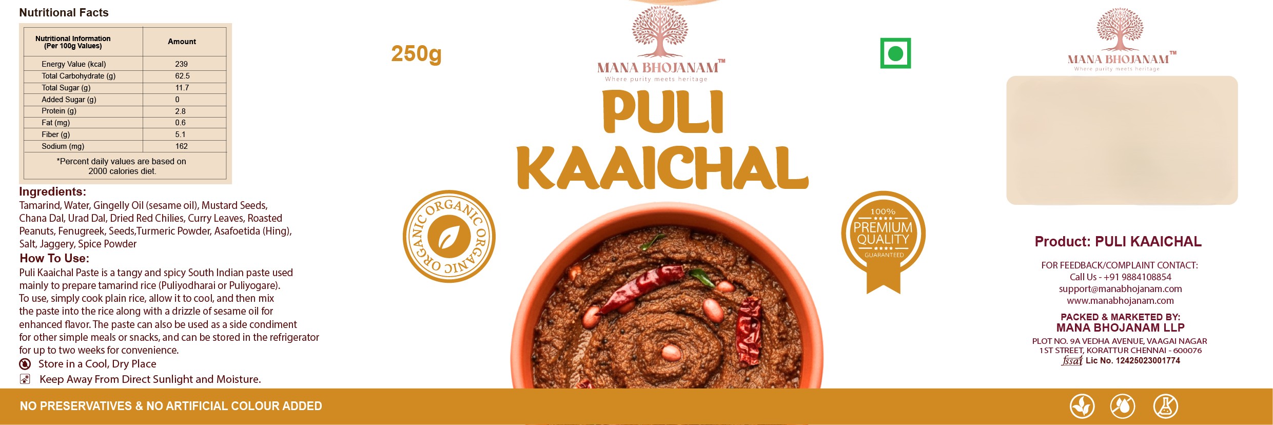 Mana Bhojanam Puli Kaaichal is a traditional South Indian delicacy prepared using high-quality tamarind, roasted spices, and cold pressed oil, following time-honoured homely recipes. Slow-cooked to perfection, this pickle offers a rich balance of tanginess, spice, and deep flavour. A staple in many South Indian homes, puli kaaichal pairs perfectly with hot rice, ghee, curd rice, and dosa. Made without artificial colours or preservatives, it delivers authentic homemade taste with long-lasting freshness.
