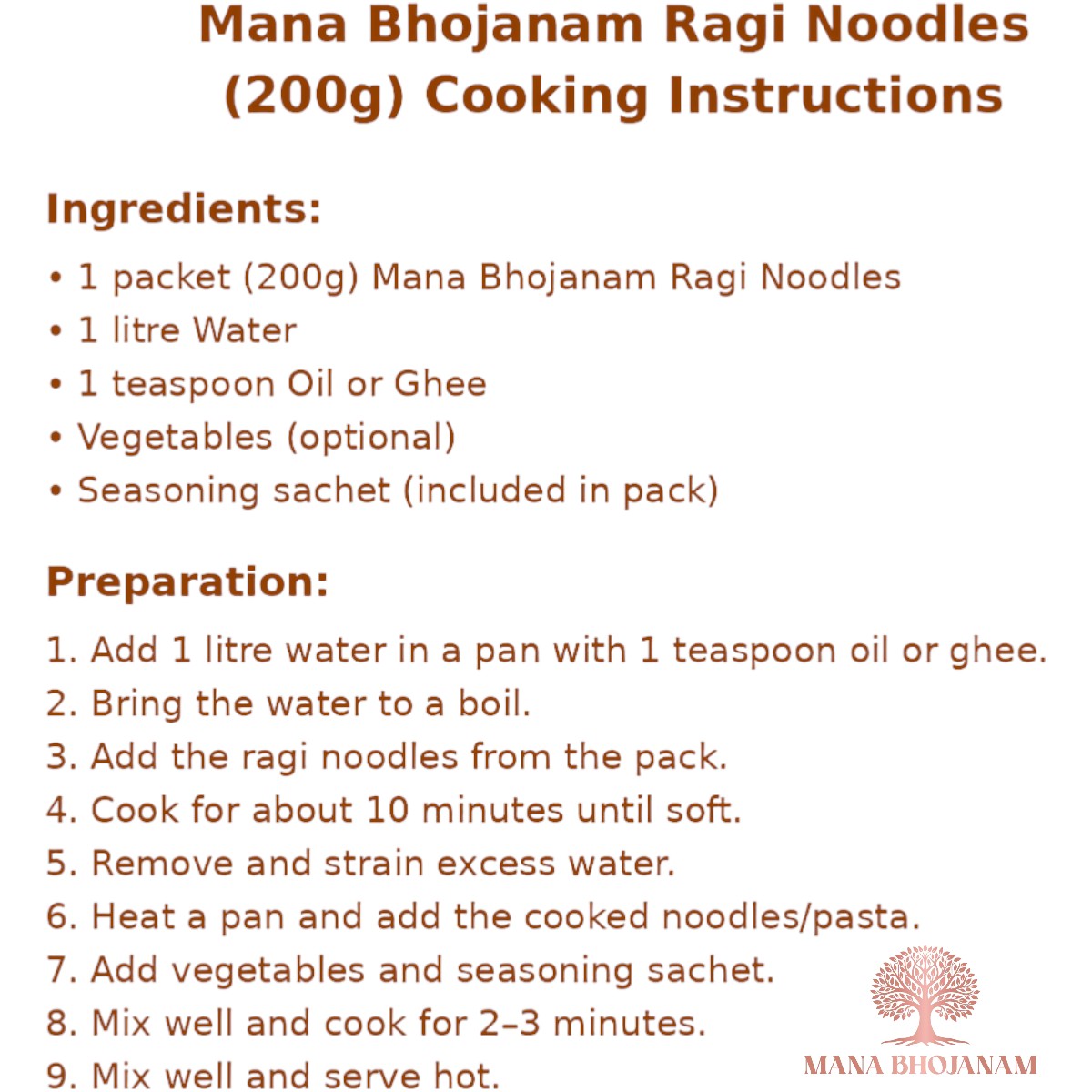 Mana Bhojanam Ragi Noodles are made from raagi (finger millet), known for its high calcium, iron, and fibre content. These noodles provide a nutritious alternative to refined flour noodles while delivering good taste and texture. Quick and easy to cook, raagi noodles are ideal for kids’ meals, lunch boxes, and healthy dinners. Prepared without maida, preservatives, or artificial colours, they support digestion, bone health, and sustained energy.