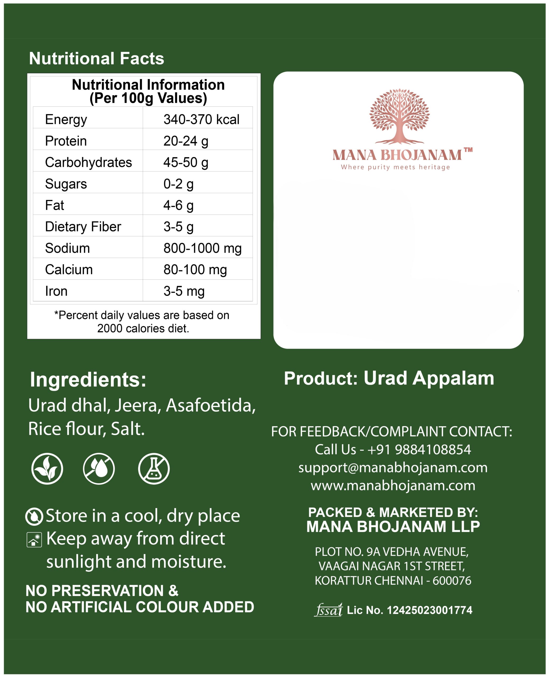Mana Bhojanam Special Urad Appalam (4″) is a classic South Indian appalam crafted using premium-quality urad dal and time-tested traditional methods. Carefully shaped to a uniform 4-inch size and sun-dried naturally, these appalams puff up beautifully when fried, delivering a light, crispy texture and rich flavour. Ideal for daily meals and special occasions, this urad appalam pairs perfectly with sambar, rasam, curd rice, and variety rice. Free from preservatives and artificial additives, it offers authentic homemade taste in every bite. At Mana Bhojanam, we ensure strict quality standards, hygienic preparation, and traditional care to bring you the true essence of homemade appalams.