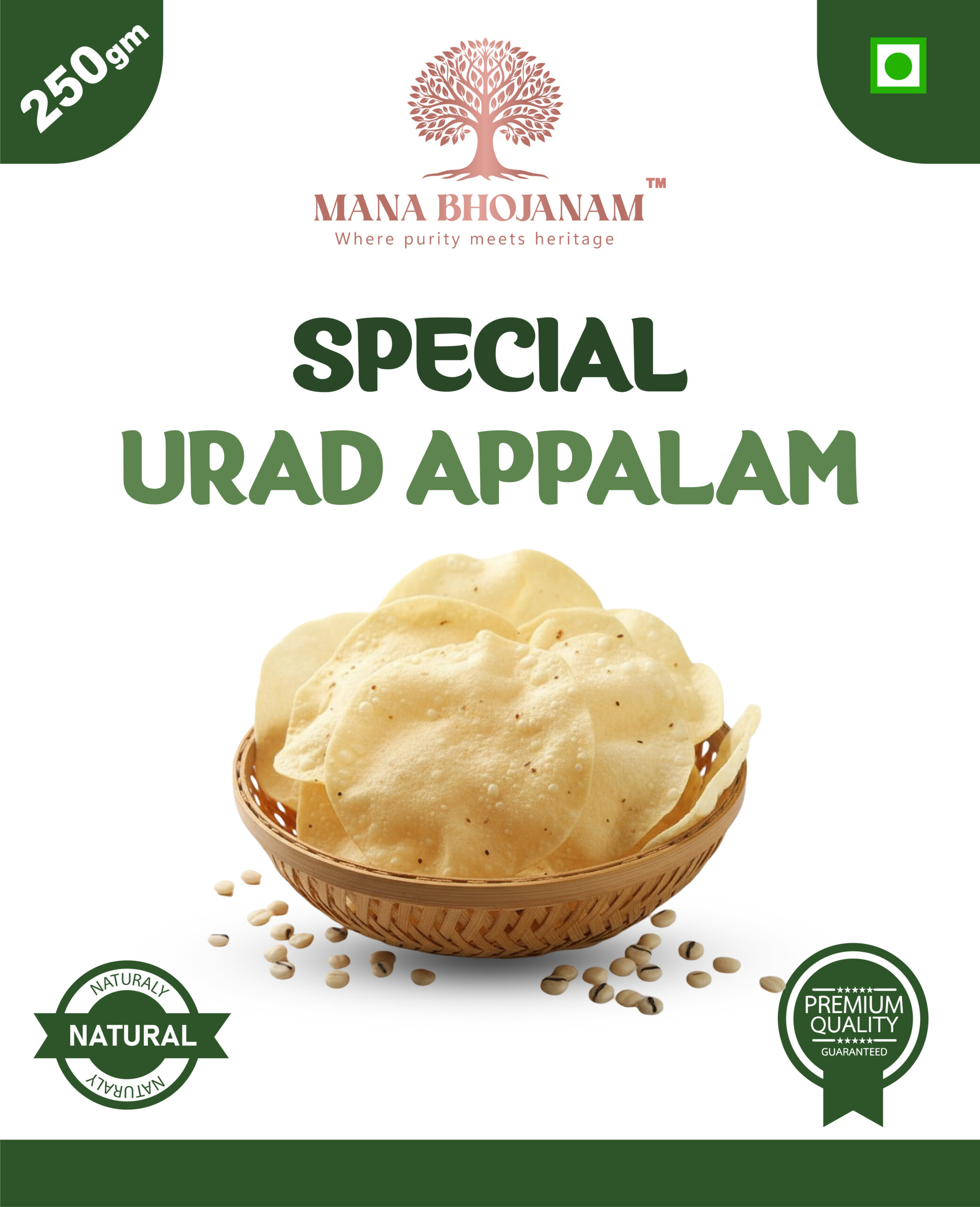 Premium Special Urad Appalam (4 inch) made from high-quality urad dal, prepared in traditional homely style and sun-dried naturally. Crispy, flavourful, and perfect for everyday and festive meals.