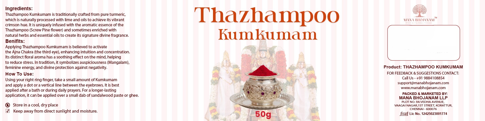 Mana Bhojanam Thazhaimpoo Kumkumam is a traditionally prepared kumkumam infused with the gentle fragrance of Thazhaimpoo (Pandanus flower). Known for its auspicious significance, this kumkumam is widely used in pooja, spiritual rituals, and by women for daily devotional wear. Carefully made following age-old practices, it offers a pleasant natural aroma and smooth texture. Free from harsh chemicals and artificial additives, this kumkumam reflects purity, tradition, and devotion.
