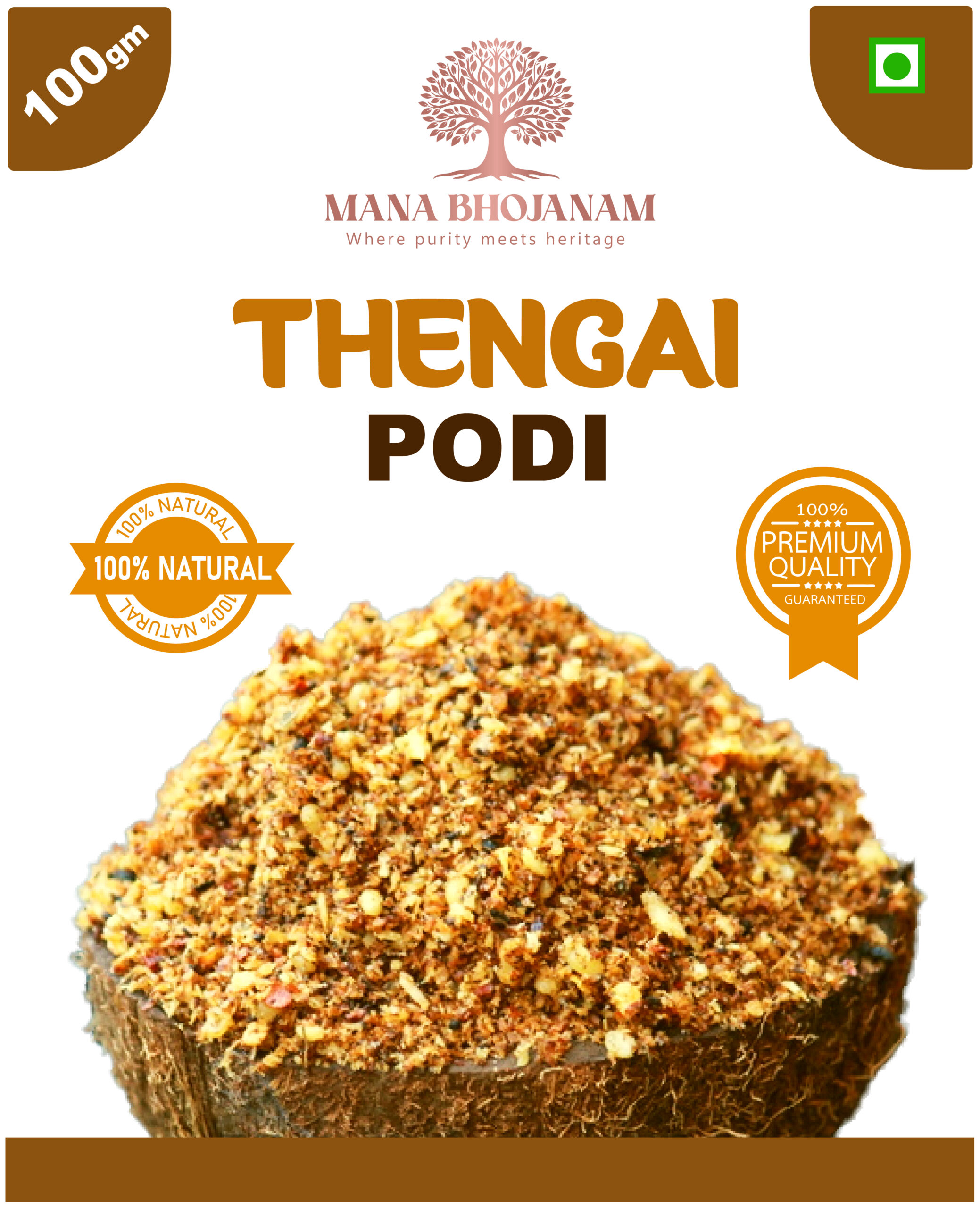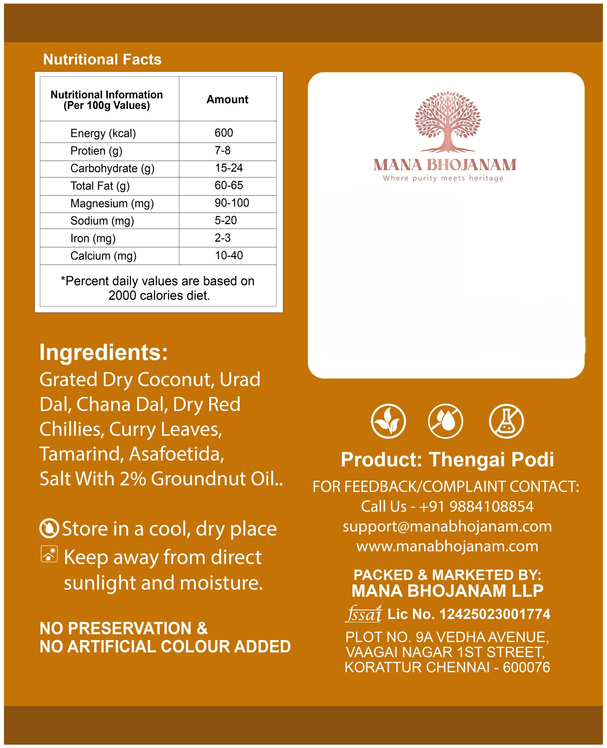 Mana Bhojanam Thengai Podi is a classic South Indian chutney powder prepared using freshly dried coconut, roasted lentils, and carefully selected spices. Made following traditional homely methods, this podi offers a rich coconut aroma with a balanced, mild spice level. Ideal for everyday meals, thengai podi tastes delicious when mixed with hot rice and ghee or gingelly oil. It also pairs well with idli, dosa, and chapati. Free from preservatives, artificial colours, and additives, it delivers authentic homemade taste and quality.