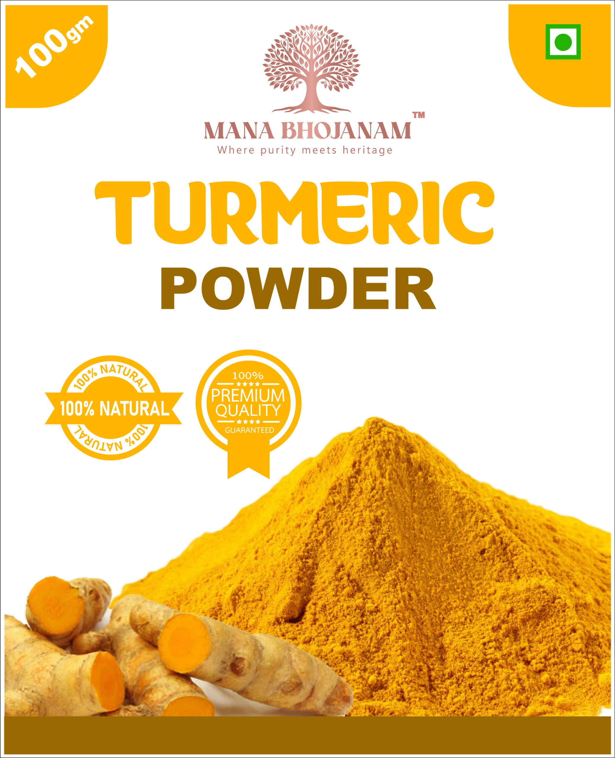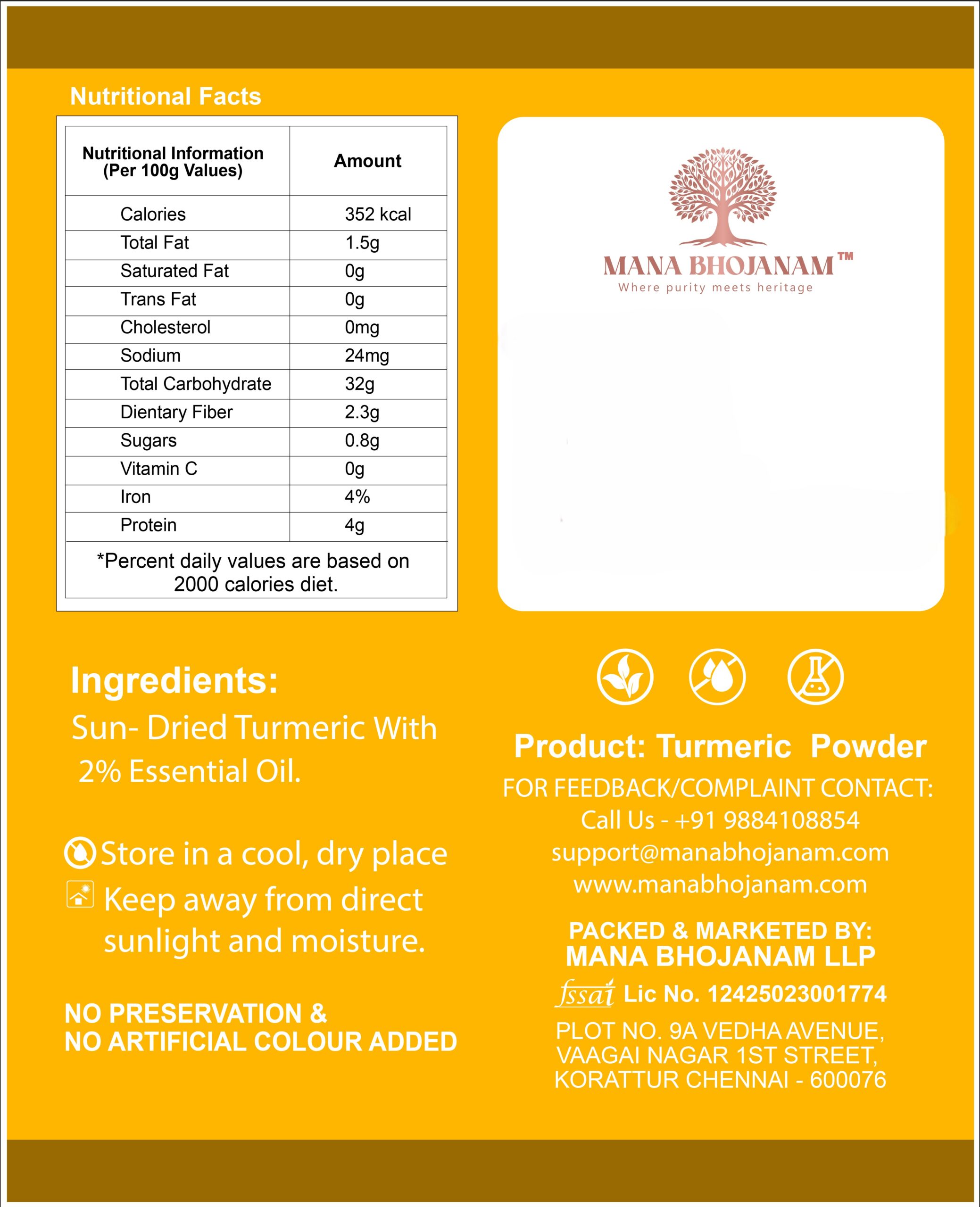 Mana Bhojanam Turmeric Powder is prepared from carefully selected turmeric rhizomes that are cleaned, boiled, sun-dried, and finely ground using traditional methods. This process helps retain its natural colour, aroma, and beneficial properties. Widely used in Indian cooking, turmeric enhances flavour, colour, and aroma of dishes. It is also traditionally valued for its use in wellness routines and home remedies. Free from artificial colours, preservatives, and additives, this turmeric powder delivers purity and authenticity in every spoon.