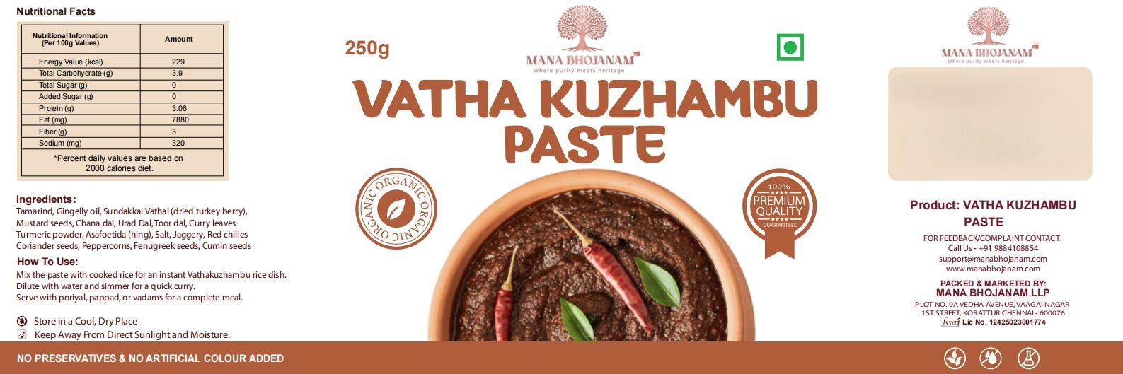 Mana Bhojanam Vathakuzhambu Paste is prepared using premium tamarind, roasted spices, and cold pressed oil, following traditional South Indian recipes. Slow-cooked to achieve deep flavour and perfect consistency, this paste helps you prepare authentic vathakuzhambu quickly and easily. Just add water, vegetables or vathal, and boil—no grinding or extra spices needed. Free from artificial colours or preservatives, this paste delivers true homemade taste and convenience.