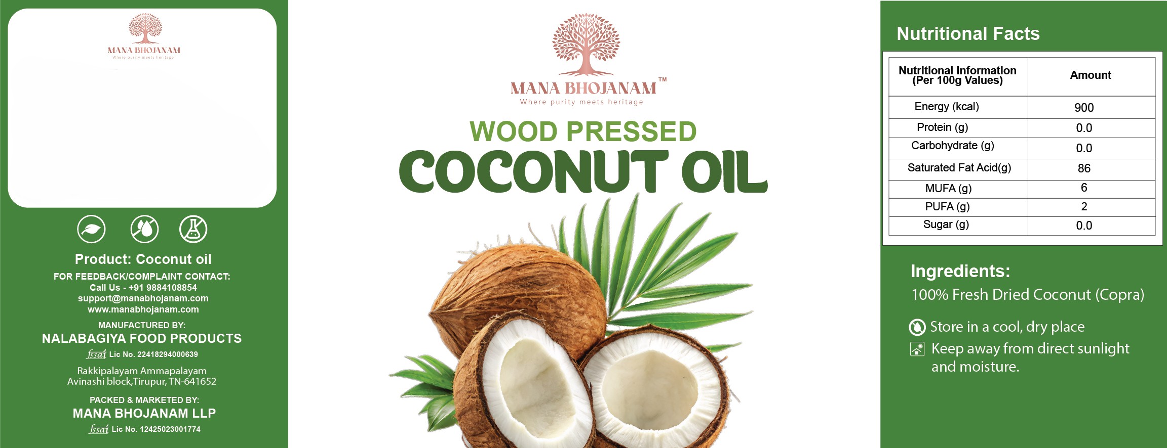 | Mana Bhojanam Wood Pressed Coconut Oil is extracted from carefully selected dried coconuts using the traditional wooden chekku (cold press) method. This slow extraction process helps retain the oil’s natural aroma, flavour, and nutritional properties without the use of heat or chemicals. Free from refining, bleaching, and deodorising, this coconut oil is suitable for daily cooking as well as hair and skin care. Its purity and quality reflect Mana Bhojanam’s commitment to natural, homely, and traditional products. |