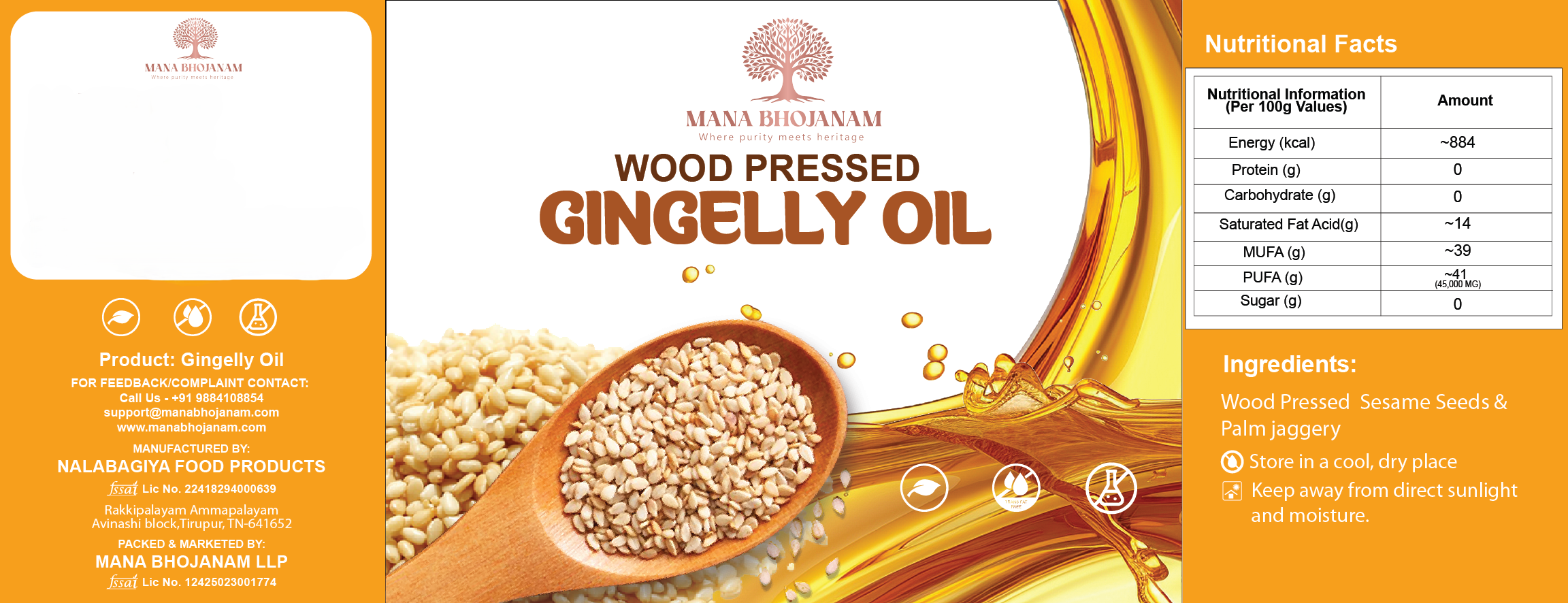| Mana Bhojanam Wood Pressed Gingelly Oil is extracted from premium-quality sesame seeds using the traditional wooden chekku (cold press) method. This slow, natural extraction retains the oil’s original nutrients, aroma, and flavour without the use of heat, chemicals, or refining. Widely used in South Indian cooking, gingelly oil enhances taste while supporting digestion and overall wellness. It is also traditionally used for oil baths, massage, skin care, and Ayurvedic practices. Free from preservatives and additives, this oil represents purity, tradition, and quality. |